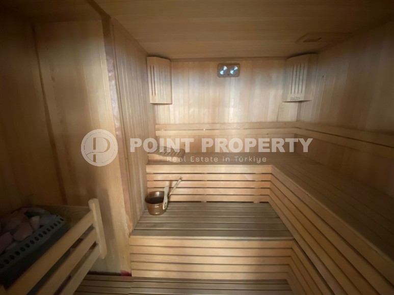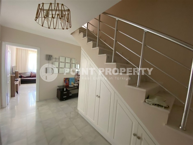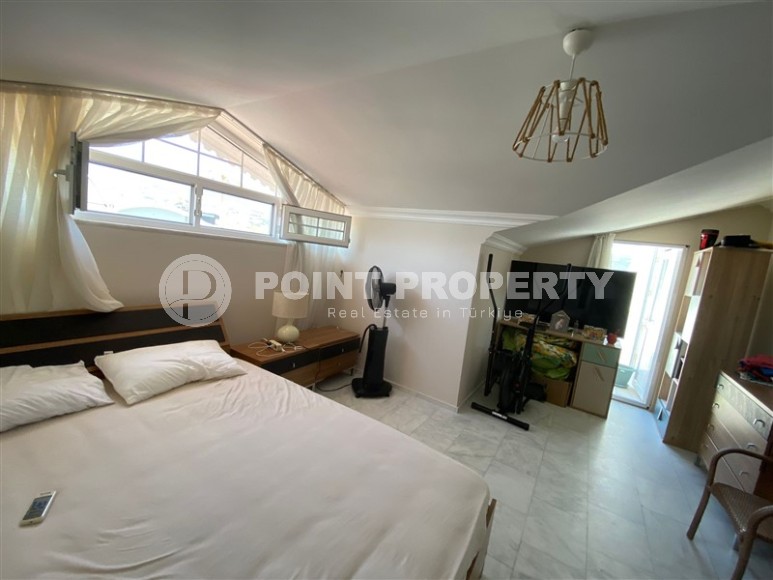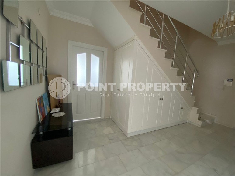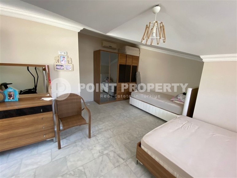 В километре от центра этого благоустроенного района, в комфортабельном жилом комплексе, выставлена на продажу просторная двухуровневая квартира, расположенная на 4-м этаже с мансардой. Общая площадь дуплекса - 200 м2, планировочное решение 3+1 представлено отдельной кухней, просторной гостиной, тремя спальнями, тремя санузлами, двумя балконами и большой открытой террасой, с видом на горы. Дизайн квартиры простой и лаконичный, с преобладанием тёплых светлых оттенков в интерьере, классических для турецких апартаментов. Гостиная укомплектована комфортабельными мягкими диванами, яркими креслами и гарнитуром. В просторной кухне установлен круглый обеденный стол, практичный белоснежный кухонный гарнитур, с массой вместительных секций для хранения продуктов, оснащён холодильником и посудомоечной машиной, а на балконе оборудована компактная кухня с плитой и духовым шкафом. В спальнях имеются удобные кровати, гардеробные шкафы, тумбы и трюмо, а в одной из комнат организована зона отдыха с мягкими диванами. Под лестницей оборудована небольшая кладовая, а на застекленном балконе и террасе установлена удобная садовая мебель.