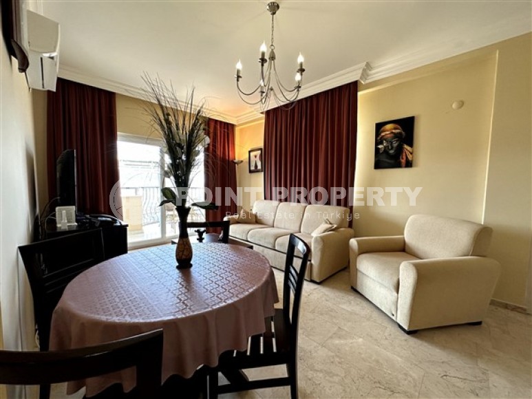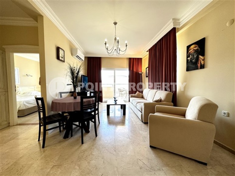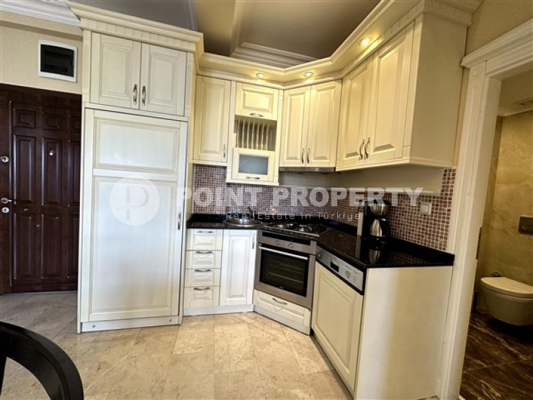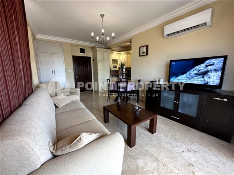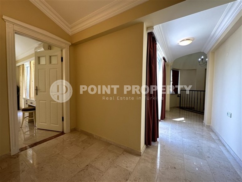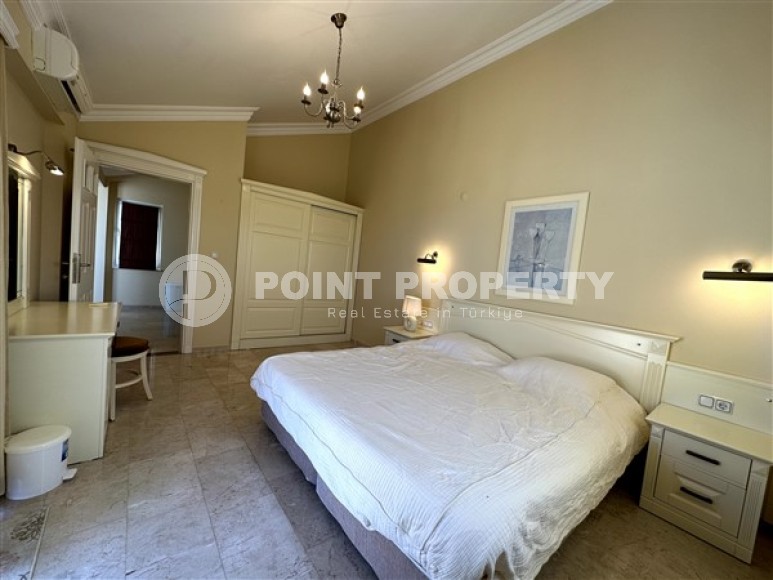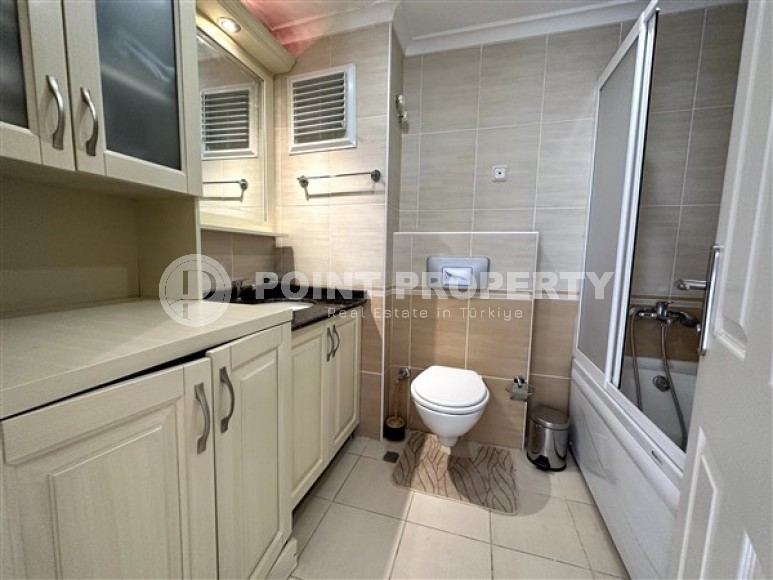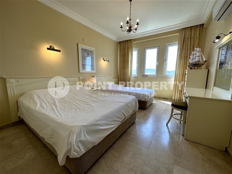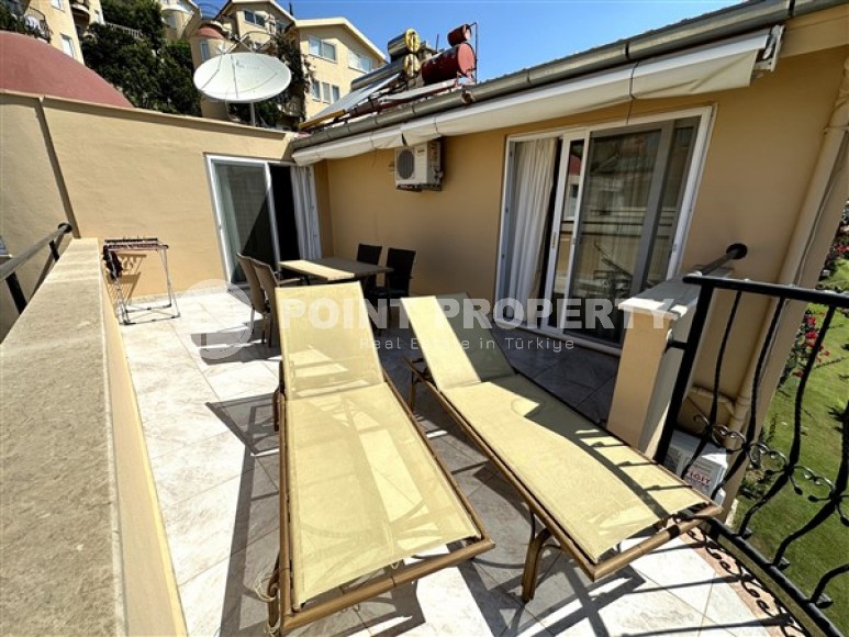 В данном разделе предлагаем обратить внимание на двухуровневую квартиру, расположенную на 2-м этаже с мансардой в уютной резиденции, построенной в 2008 году в двух километрах от центра района Каргыджак. Дуплекс 2+1, общей площадью 100 м2, имеет в планировке совмещенную с кухней гостиную, разделенную на обеденную зону и салон, две спальни, два санузла, оснащенных душевой кабиной и ванной, балкон и просторную открытую террасу с панорамным видом на море и город. Дизайн апартаментов простой и лаконичный, с классическими светлыми оттенками в интерьере. Гостиная укомплектована комфортабельными диваном и креслом, журнальным столиком, комодом и круглым обеденным столом, компактный кухонный уголок оснащен встроенным холодильником, посудомоечной машиной и духовым шкафом, в спальнях имеются удобные кровати, гарнитуры, трюмо и вместительный гардеробный шкаф. На балконе с видом на море установлена садовая мебель, а на террасе организована территория для загара с шезлонгами.