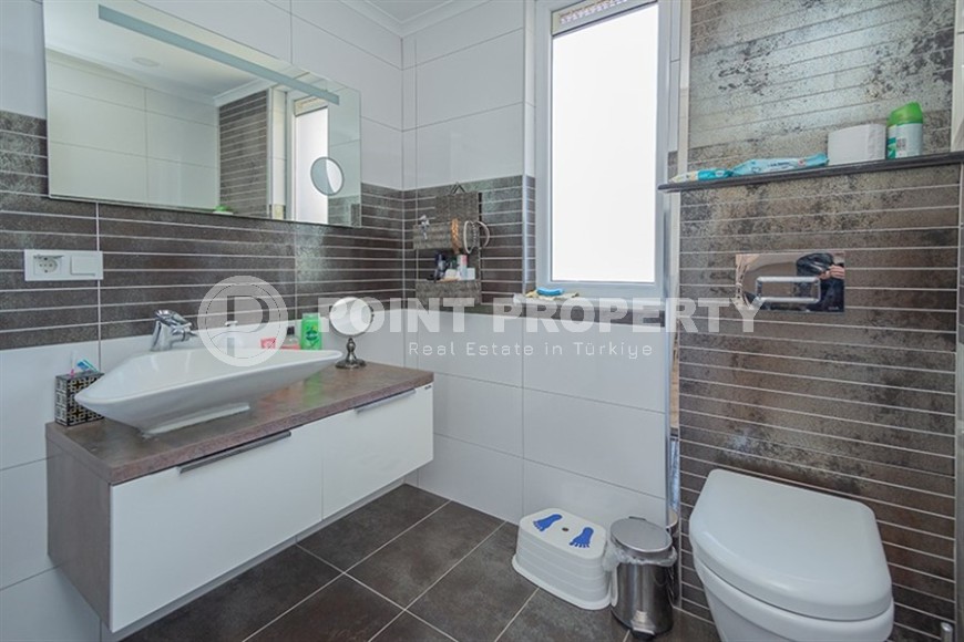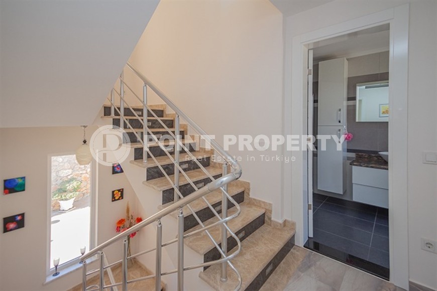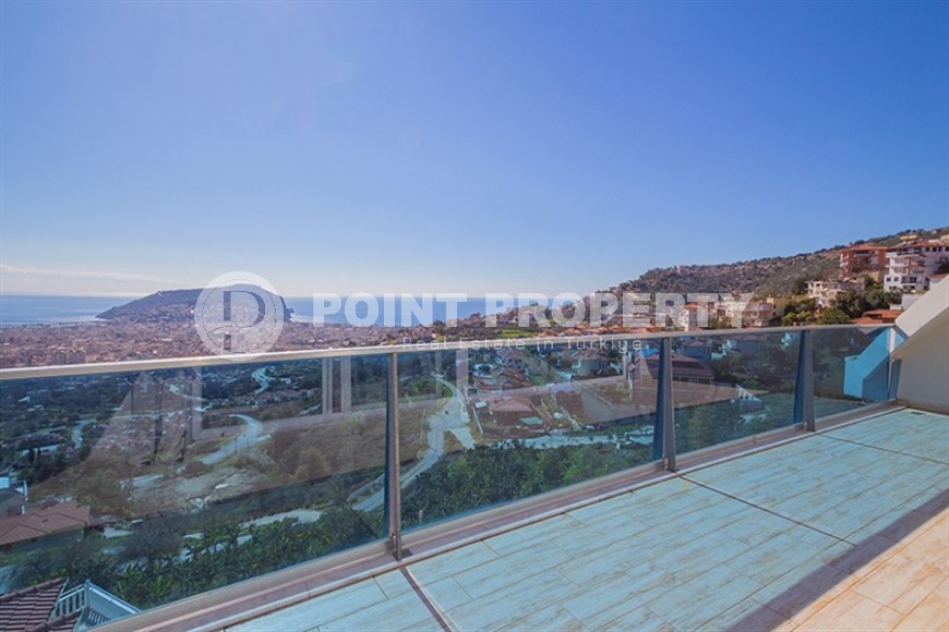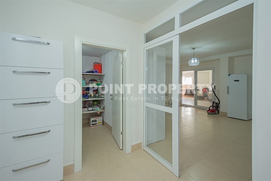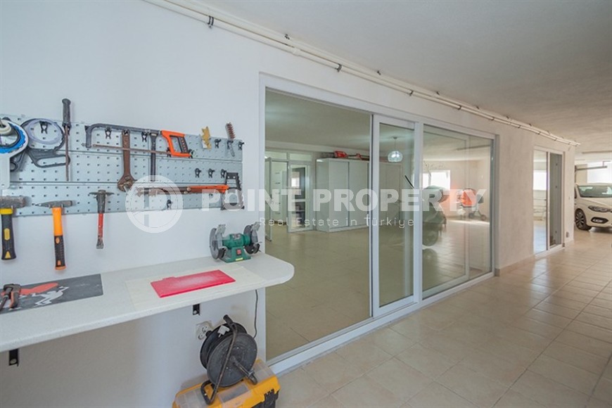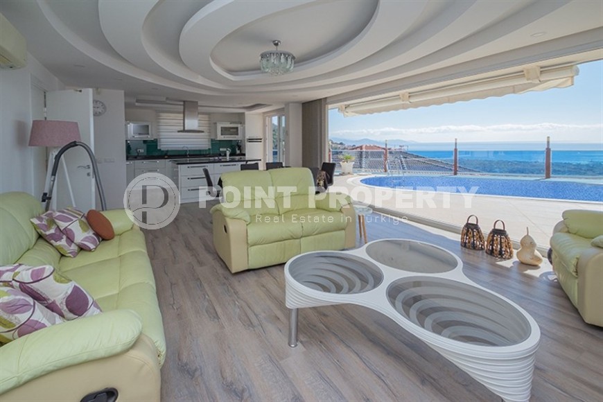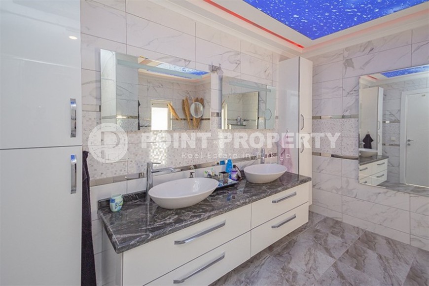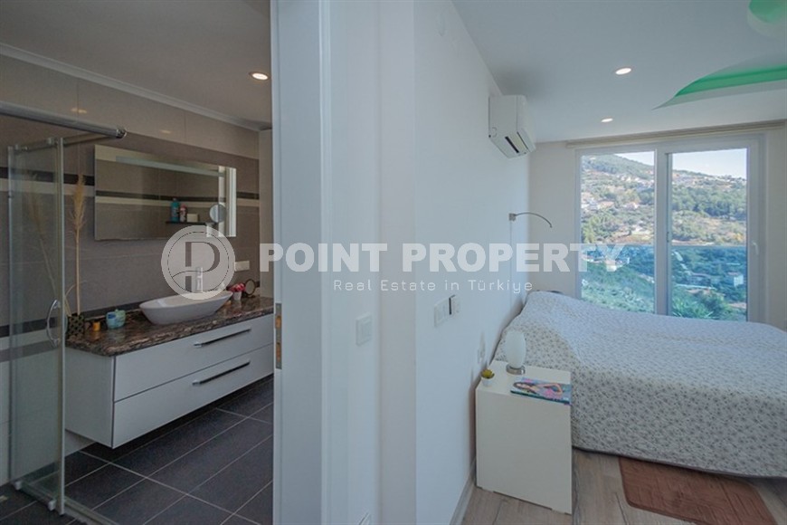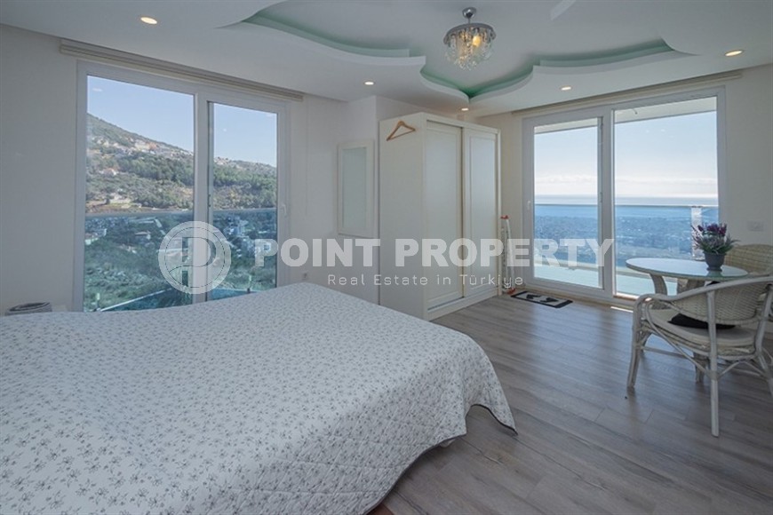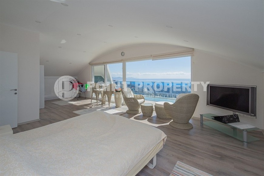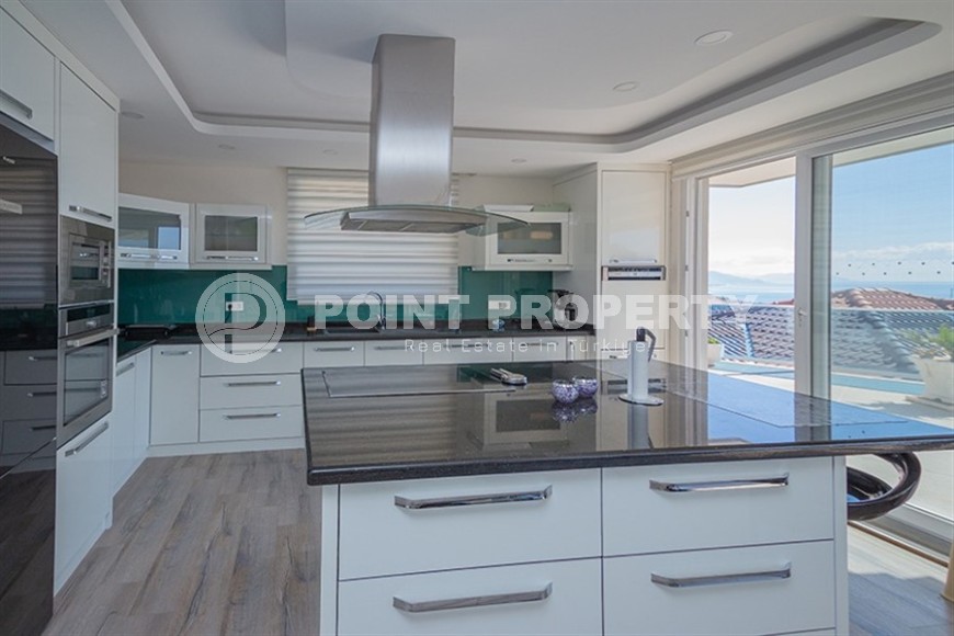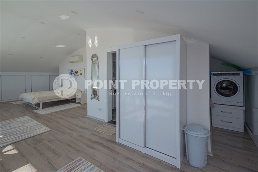 Просторный трехэтажный дом, общей площадью 400 м2, был построен в 2006 году, и имеет в планировке американскую кухню открытого типа, совмещенную с гостиной, четыре спальни, четыре санузла, два балкона и открытую террасу. Кроме того, весь нижний этаж виллы выделен под технические помещения, мастерскую, гараж и паркинг. Особенностью данной виллы являются ее уникальные видовые характеристики - из каждой комнаты открываются роскошные панорамные виды на море, горы и крепость Аланьи. Дизайн виллы оформлен в современном лаконичном стиле, и полностью соответствует представлению об элитных летних резиденциях на престижных курортах. В интерьере преобладает белый цвет, создающий ощущение легкости, пространства и гармонии. Вилла полностью укомплектована стильной мебелью и высококлассной бытовой техникой, и готова к проживанию. Гостиная визуально разделена на несколько функциональных зон - обеденную, с большим столом, салон, с комфортабельными мягкими диванами, креслом и оригинальным журнальным столиком, и стильную кухню, оснащенную по последнему слову техники. В каждой спальне, кроме кроватей, шкафов и гарнитуров, организована дополнительная зона отдыха, а в одной из комнат оборудован рабочий кабинет, с письменным столом и диваном. Очень удобно и то, что из гостиной есть выход к бассейну и в сад.