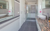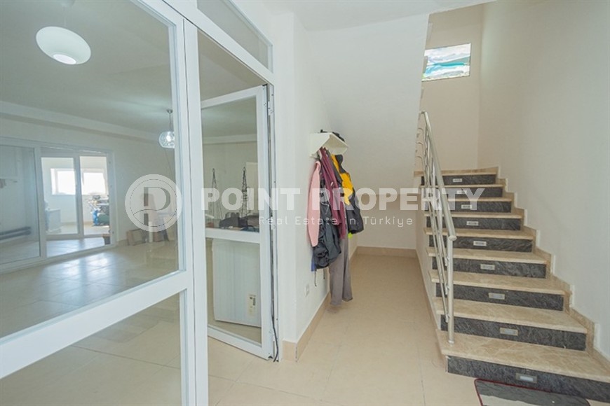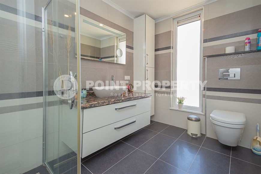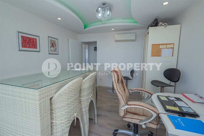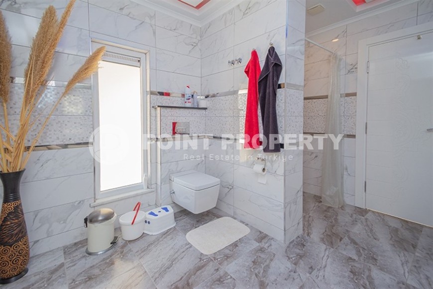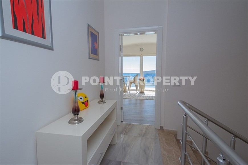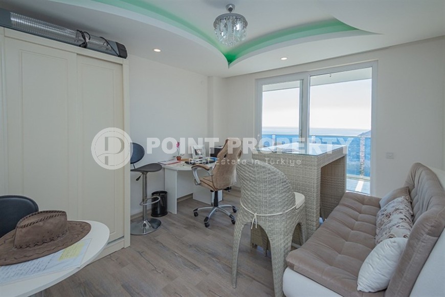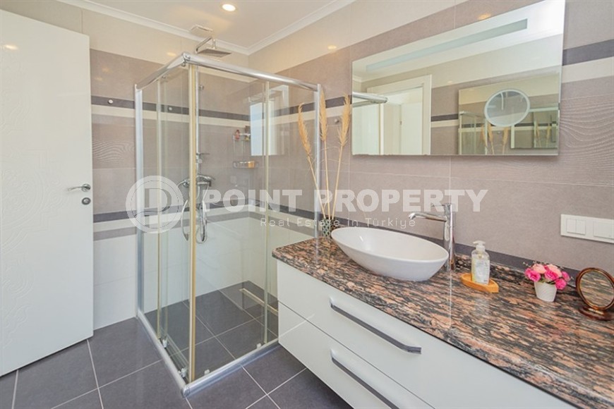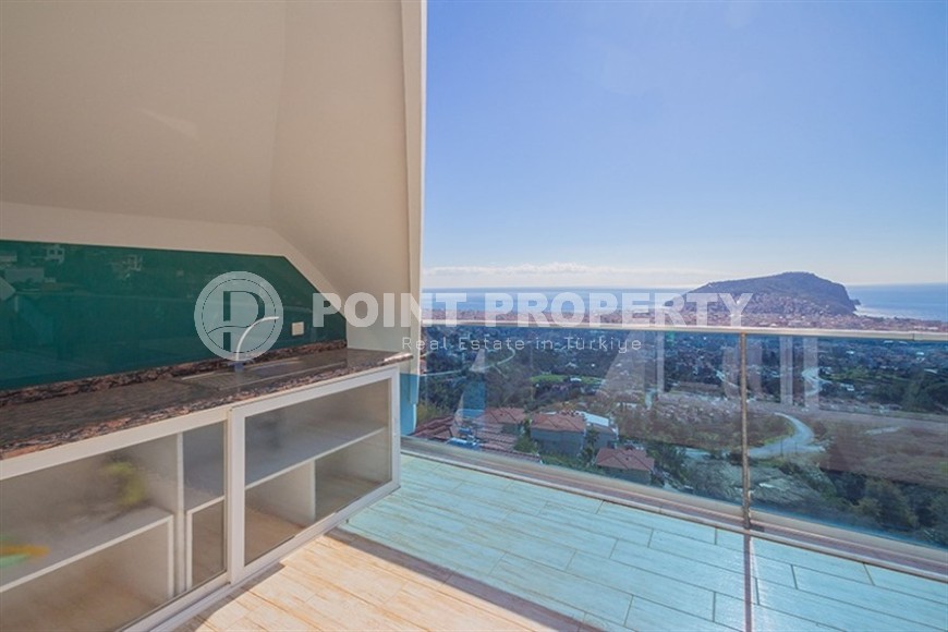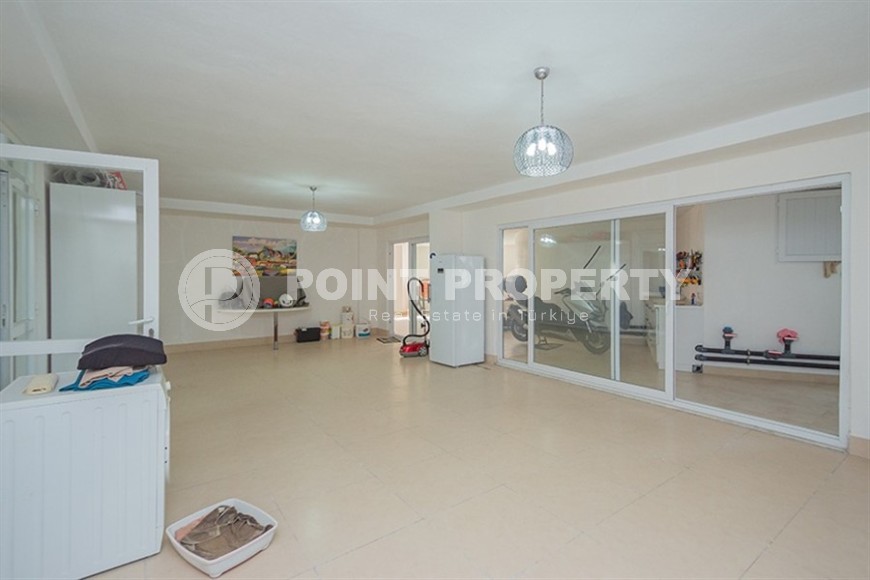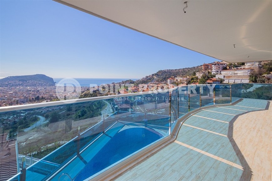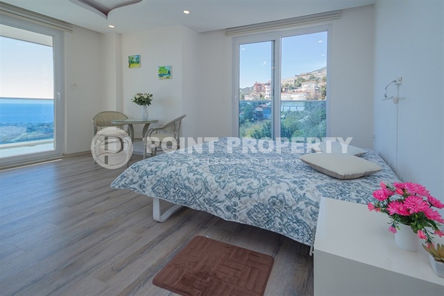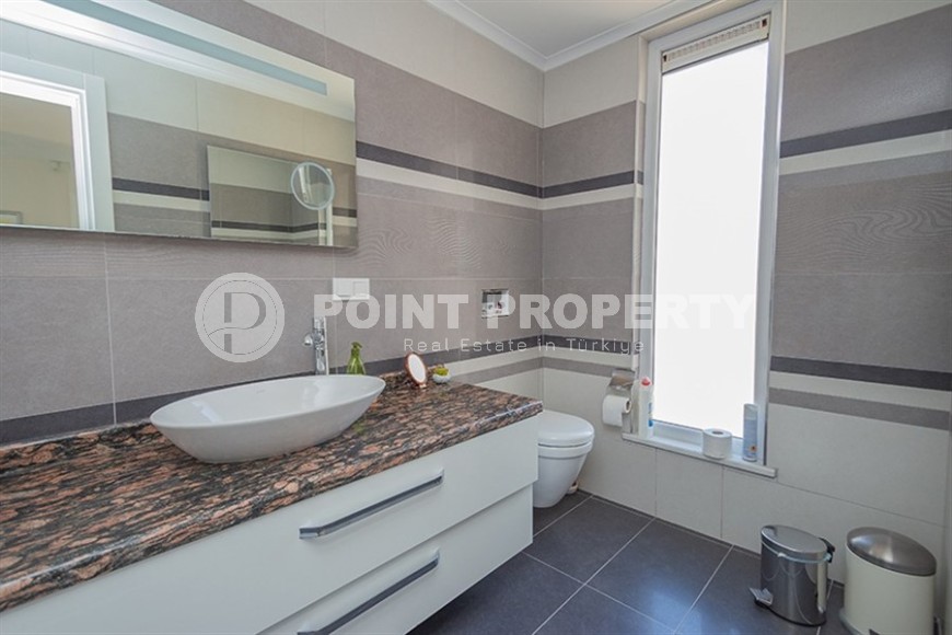 Просторный трехэтажный дом, общей площадью 400 м2, был построен в 2006 году, и имеет в планировке американскую кухню открытого типа, совмещенную с гостиной, четыре спальни, четыре санузла, два балкона и открытую террасу. Кроме того, весь нижний этаж виллы выделен под технические помещения, мастерскую, гараж и паркинг. Особенностью данной виллы являются ее уникальные видовые характеристики - из каждой комнаты открываются роскошные панорамные виды на море, горы и крепость Аланьи. Дизайн виллы оформлен в современном лаконичном стиле, и полностью соответствует представлению об элитных летних резиденциях на престижных курортах. В интерьере преобладает белый цвет, создающий ощущение легкости, пространства и гармонии. Вилла полностью укомплектована стильной мебелью и высококлассной бытовой техникой, и готова к проживанию. Гостиная визуально разделена на несколько функциональных зон - обеденную, с большим столом, салон, с комфортабельными мягкими диванами, креслом и оригинальным журнальным столиком, и стильную кухню, оснащенную по последнему слову техники. В каждой спальне, кроме кроватей, шкафов и гарнитуров, организована дополнительная зона отдыха, а в одной из комнат оборудован рабочий кабинет, с письменным столом и диваном. Очень удобно и то, что из гостиной есть выход к бассейну и в сад.
