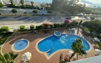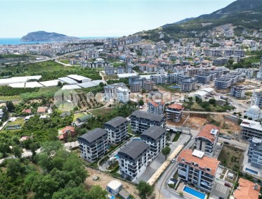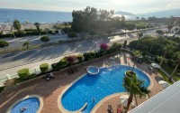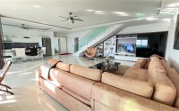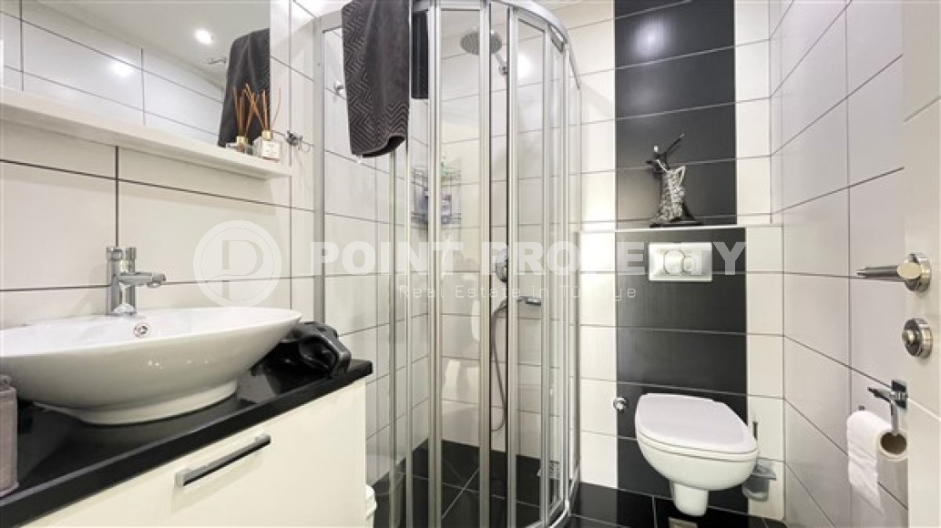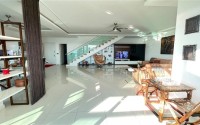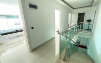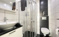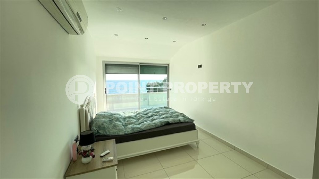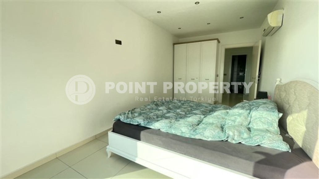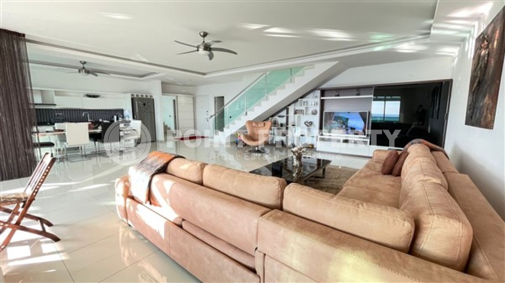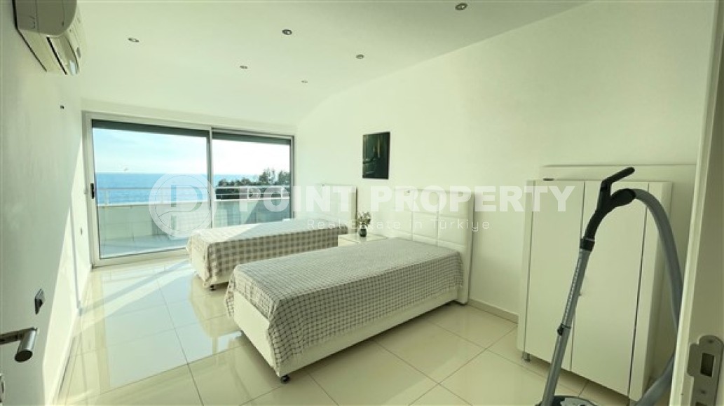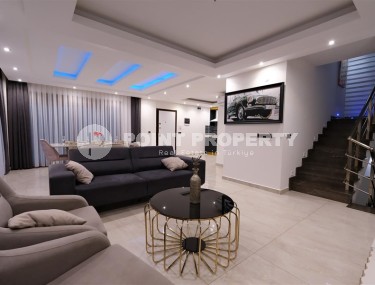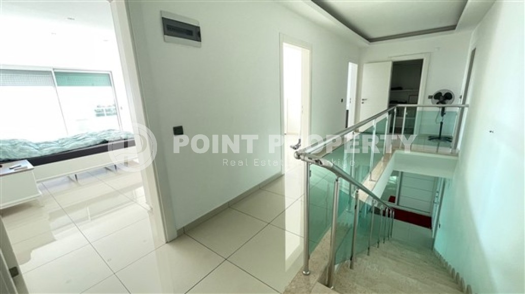 В салоне установлен большой угловой диван и мягкие кресла, журнальный столик, телевизор, современная корпусная мебель для хранения личных вещей и декоративных предметов интерьера, кондиционер. Большая кухонная зона оборудована функциональным гарнитуром, с большим количеством отделений для хранения предметов быта, необходимой бытовой техникой обеденным столом на шесть персон. Из помещения есть выход на большой застекленный балкон, оборудованный садовой мебелью, как дополнительное место отдыха. Во всех спальных комнатах установлены удобные кровати, прикроватные тумбы, шкафы для хранения личных вещей, кондиционеры. Санузлы оборудованы необходимым набором мебели, сантехники, душевыми кабинами, стены и пол - керамика. Со второго этажа есть выход на террасу с потрясающим видом на Средиземное море, протяженную береговую линию и главную достопримечательность города “Аланийскую крепость”.