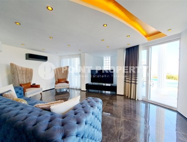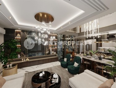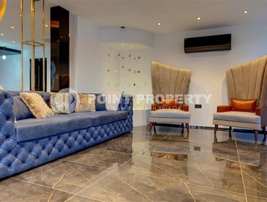 В данном разделе представлена роскошная двухуровневая квартира 3+1, общей площадью 220 м2, к многочисленным преимуществам которой относятся: удачная планировка, стильный современный дизайн, отличная локация в 50 метрах от пляжа и в нескольких минутах ходьбы от центра престижного живописного района Аланьи - Каргыджак. Апартаменты находятся на 1-м и 2-м этажах в жилом комплексе, построенном в 2021 году, и состоят из американской кухни, просторной гостиной, трех спален, трех оснащенных душевыми кабинами санузлов, и двух балконов, с одного из которых открывается вид на море. Квартира светлая и воздушная, с панорамными окнами, легкими шторами, мягким многоуровневым освещением, стильными сочетаниями модных оттенков в интерьере. Гостиная визуально разделена на несколько функциональных зон - территорию отдыха с комфортабельными креслами и диваном, место для просмотра телевизора, обеденную зону, кроме того, кухня отделена от салона стильной стойкой, которую можно использовать в качестве небольшого стола. Яркими акцентами в спокойном дизайне гостиной выступают оформленная в стиле эко стена с модным гарнитуром, и мягкая мебель глубокого цвета морской волны. Более спокойные спальни укомплектованы удобными кроватями, вместительными гардеробными шкафами, комодами и трюмо, а большой черно-белый кухонный уголок, с массой секций для хранения продуктов, оснащен новейшей бытовой техникой. Апартаменты полностью готовы к проживанию, что позволяет новым владельцам переехать в кратчайшие сроки, и наслаждаться комфортной уютной атмосферой.