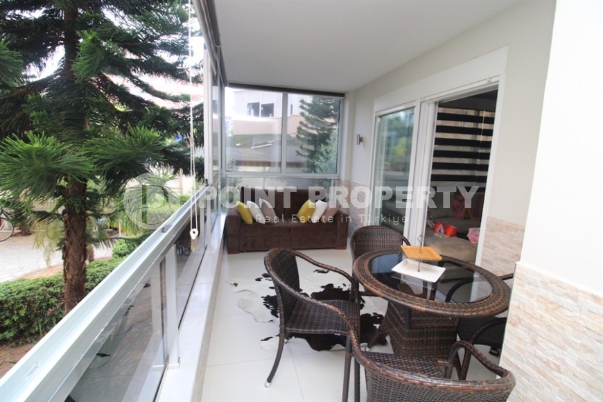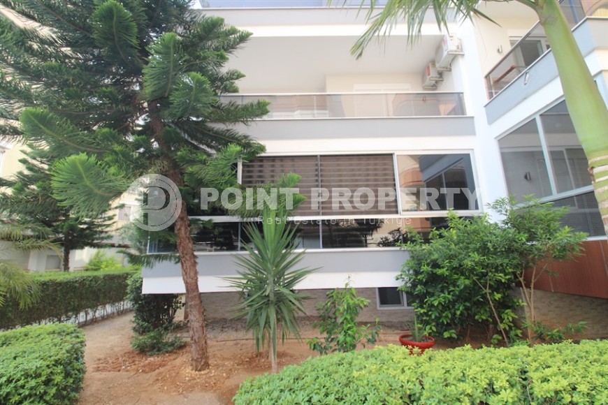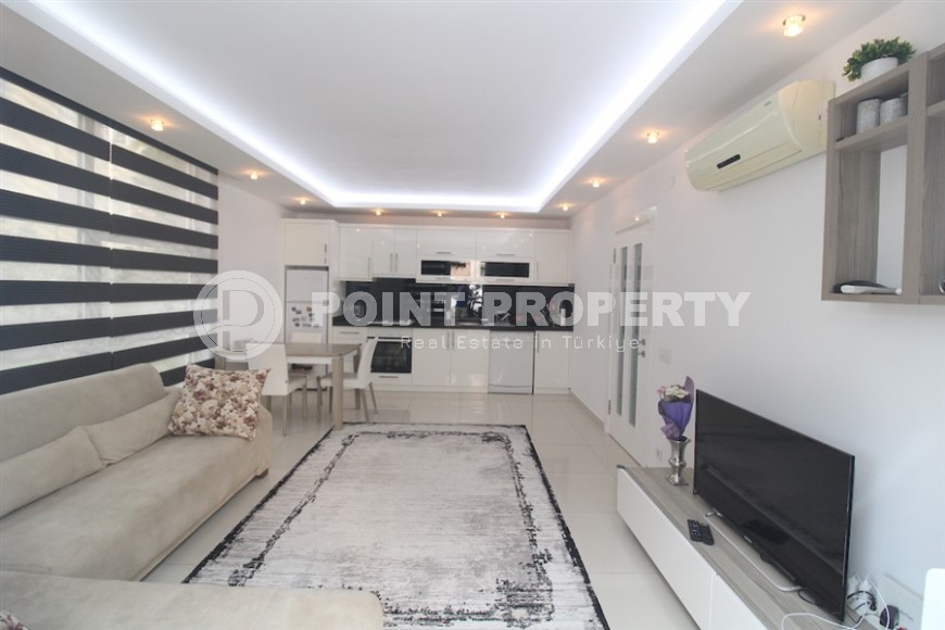 Портфолио компании Point Property пополнила небольшая комфортабельная квартира, с уникальной локацией в самом центре Аланьи и в пяти минутах ходьбы от знаменитого пляжа Клеопатры. Квартира светлая и уютная, укомплектована всей необходимой мебелью и бытовой техникой, и готова к проживанию. Расположена она на 1-м этаже в доме 2014 года постройки, имеет общую площадь 65 м2, и состоит из совмещенной с кухней гостиной, одной спальни, санузла и просторного застекленного балкона. Дизайн квартиры современный и лаконичный, с преобладанием белого цвета в интерьере, что создает ощущение легкости и чистоты. В гостиной организована комфортабельная зона отдыха, с большим угловым диваном и современной корпусной мебелью - тумбой и лаконичными навесными полками, ближе к кухне установлен компактный обеденный стол. Практичная белоснежная кухня оснащена холодильником, посудомоечной машиной и духовым шкафом, спальня укомплектована комфортабельной кроватью, трюмо и гардеробным шкафом, а при входе имеется еще один шкаф для обуви и верхней одежды. Из обеих комнат есть выход на просторный балкон, с видом на зеленый сад, где установлены удобный диван и плетеные кресла с круглым столом.