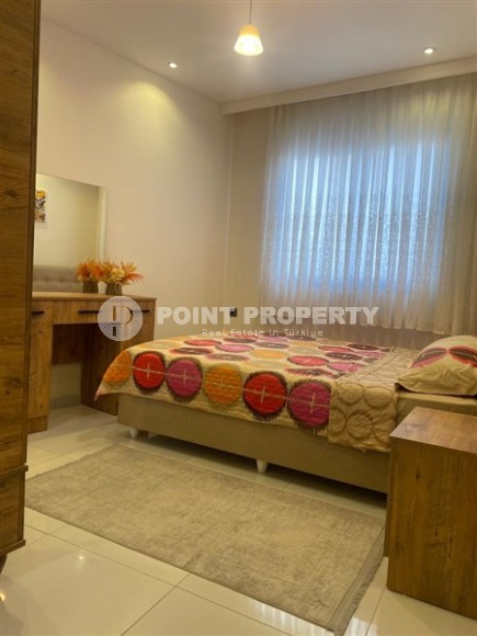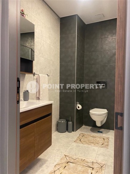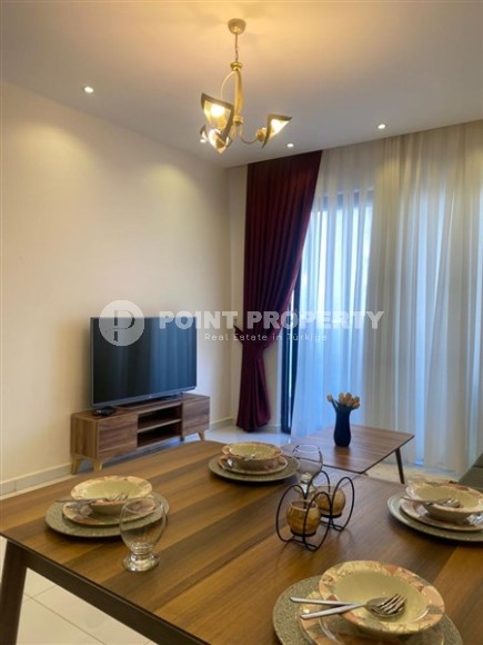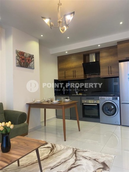 Современный район Аланьи - Махмутлар является одним из самых густонаселенных и оживленных в городе. Недвижимость тут представлена многоэтажными жилыми комплексами, а инфраструктура не уступает современным мегаполисам. В 2021 году в нескольких минутах ходьбы от центра этого комфортабельного для жизни района завершилось строительство роскошной резиденции, на 3-м этаже которой выставлена на продажу квартира. Компактные апартаменты 1+1, общей площадью 55 м2, имеют в планировке совмещенную с кухней гостиную, спальню, санузел и балкон. Дизайн квартиры минималистический и современный, с преобладанием светлых оттенков в интерьере, мягким потолочным освещением и деревянной мебелью в эко стиле. Салон визуально разделен на территорию отдыха с мягким диваном, тумбой и кофейным столиком, и обеденную зону. Спальня оформлена в таком же стиле и укомплектована большой кроватью, комодом и вместительным гардеробным шкафом. Кухонный гарнитур, с сочетанием модного серого, практичного черного цветов и дерева, оснащен современной бытовой техникой, а в санузле установлена качественная душевая кабина и стильная керамика. Апартаменты полностью готовы к проживанию, так что новые владельцы могут планировать переезд непосредственно после оформления сделки и наслаждаться уютной комфортной атмосферой.