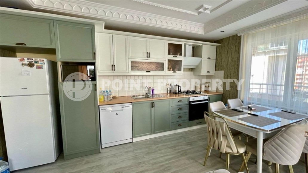 Стильная и уютная квартира 2+1 площадью 110 м² расположена на 2 этаже жилого комплекса в Тосмуре. Квартира с хорошей мебелью включает две просторные спальни, светлую гостиную, совмещённую с кухней, две ванные комнаты и два балкона, с которых открывается приятный вид.