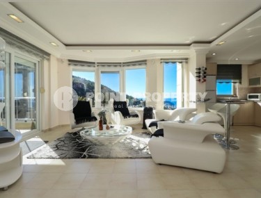Представленная в данном разделе квартира - прекрасное сочетание современного стильного дизайна и отличной локации. Расположена она на 4-м этаже в резиденции на первой линии от моря в самом центре популярного района Аланьи Махмутлар. В планировке апартаментов, общей площадью 115 м2, большая кухня, отделенная от просторной гостиной изящной аркой, две спальни, два санузла и два балкона с роскошным видом на море. Квартира стильная и современная, с комфортабельной мебелью и всей необходимой бытовой техникой, и полностью готова к проживанию. В интерьере удачно сочетаются светлые и темные оттенки, в салоне - массивная мягкая мебель, в спальнях - большие кровати и модные гарнитуры, в санузлах установлены современные душевые кабины, а стильный черный кухонный уголок оснащен по последнему слову техники. Изюминку и индивидуальность апартаментам придают дизайнерские оформления стен и необычные авторские люстры. Отдельного упоминания стоят балконы, с одного из которых открывается невероятный вид на море и набережную.