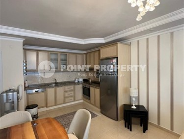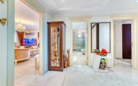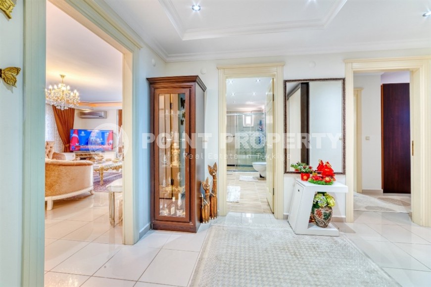 Если вы предпочитаете просторные планировки апартаментов, элементы классики в дизайне, и светлые интерьеры, представленная в данном разделе квартира наверняка произведет на вас приятное впечатление. Комфортабельная, с большой общей площадью 170 м2, она прекрасно подходит для проживания семьи с детьми. Расположена квартира на 2-м этаже в жилом комплексе, построенном в 2004 году, в нескольких минутах ходьбы от центра современного района Аланьи - Махмутлар. Планировочное решение 2+1 представлено кухней, гостиной, двумя спальнями, двумя оснащенными душевыми кабинами и системой подогрева пола санузлами, и двумя просторными балконами, с видом на город. В современном, светлом дизайне комнат удачно смотрятся хрустальные люстры, тяжелые плотные шторы и изящная классическая мебель. В центре гостиной организована комфортабельная зона отдыха, с мягкими диванами нежного бежевого цвета, массивными креслами, сервантом, изысканным комодом в старинном стиле, тумбой, пуфом и роскошным журнальным столиком, с резными ножками. Просторная кухня отделена от салона высокой стойкой, исполняющей роль, и укомплектована круглым обеденным столом и современным гарнитуром, оснащенным всей необходимой бытовой техникой. Из гостиной есть выход на большой застекленный балкон, где установлены кожаный диван, мягкие стулья и деревянный журнальный столик. В уютных спальнях имеются удобные кровати, тумбы, трюмо, комоды и гардеробные шкафы, а на балконе установлен дополнительный шкаф для одежды.
